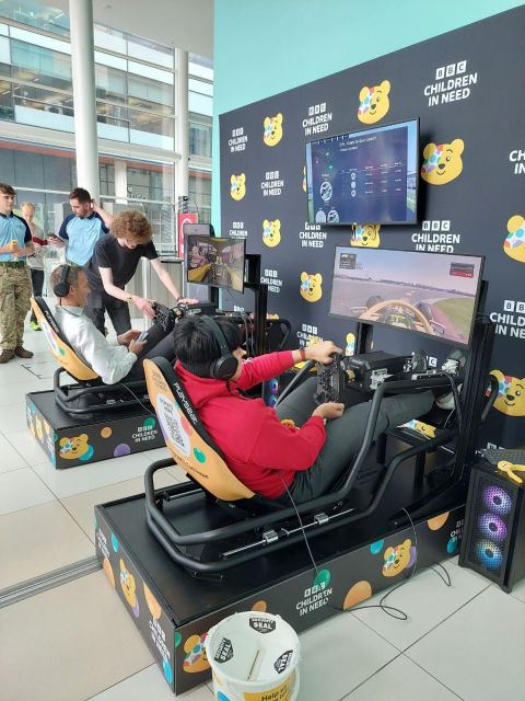 Avoiding the great British weather, our students attended the BBC Children In Need event alongside their tutor, Kevin. The Sim Rig was ready and waiting for their arrival as well as students from UTC Media City, Access Creative College, Future Skills and students from the University of Salford Business School.